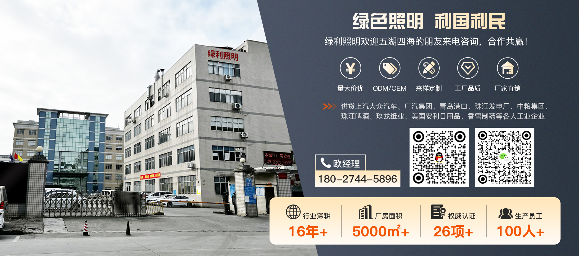 广州绿利照明工程有限公司专业从事于工业照明节能系列产品的研发、生产、销售。公司拥有多名专业照明技术专家,研发部设在广州番禺,在番禺、东莞设有生产工厂,经过多年对LED技术的潜心研究和LED照明产品的开发,公司获得多项国家知识产权专利,产品成功通过CCC、FCC、CE、ROHS等国内,国际权威机构认证。